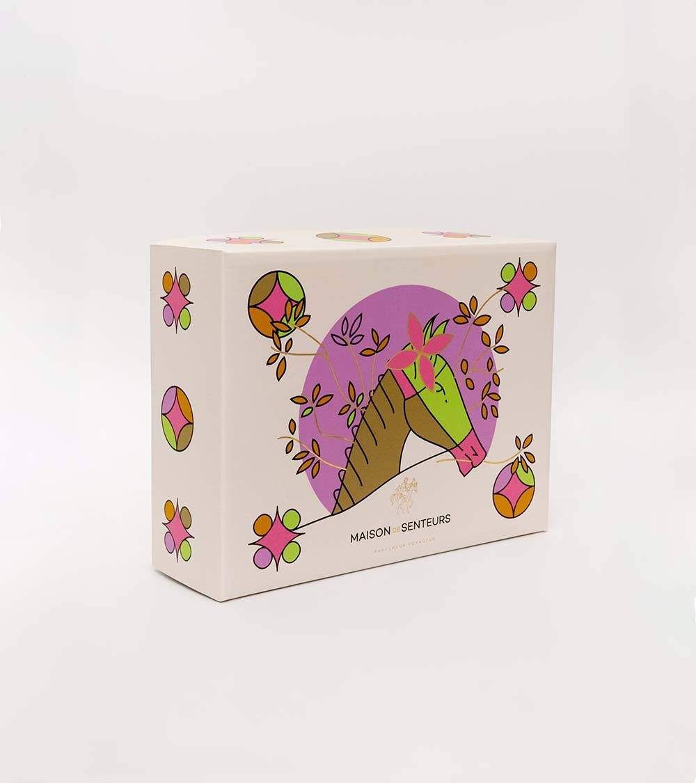 Des coffrets uniques, symboles de voyage et d’aventure. Chaque coffret raconte une histoire olfactive qui transporte vers des horizons lointains, fidèle à l’esprit de Maison de Senteurs, Parfumeur Voyageur. Des illustrations délicates et poétiques accompagnent les fragrances, invitant à un voyage sensoriel où chaque détail évoque le mouvement, la liberté et la découverte.