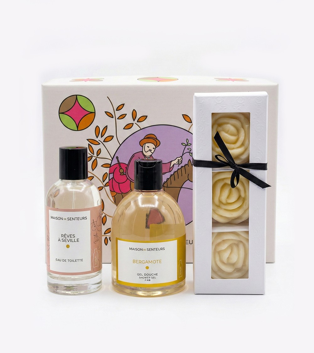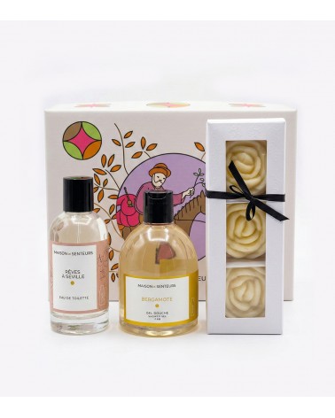 Notre coffret Rêve à Séville Pour Elle est composé d'un eau de toilette Rêve à Séville, d'un gel douche Calendula Bergamote, et d'un pack savon fleur bergamote. Plongez dans une ambiance envoûtante et rafraîchissante avec ce trio harmonieux.