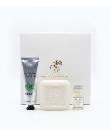 Le coffret Jasmin se compose d'une crème mains Karité & Macadamia Jasmin, d'un extrait de parfum Jasmin du Matin, et d'un savon Jasmin Sambac. Un ensemble raffiné pour envelopper vos sens dans la douceur enivrante du jasmin.